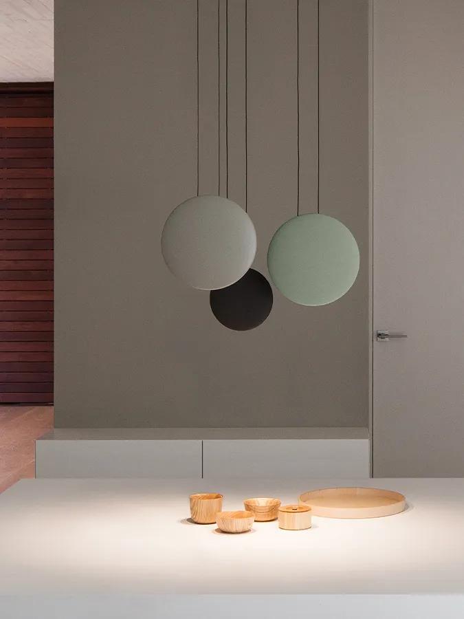 The Cosmos collection consists of pendant light clusters, flattened forms of different sizes that create an optical illusion of hanging spheres that appear to be floating in the air.