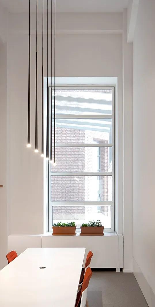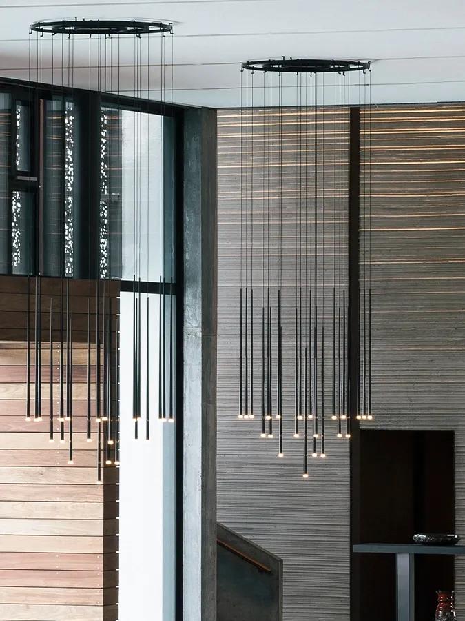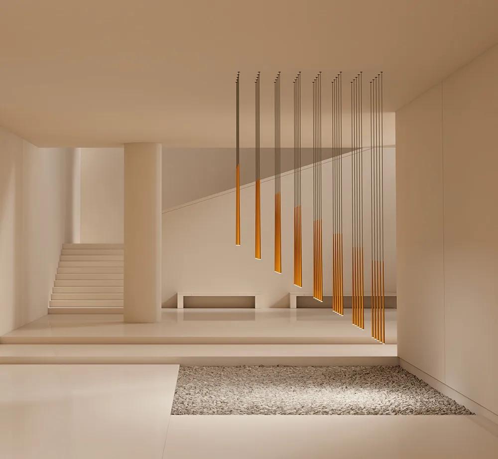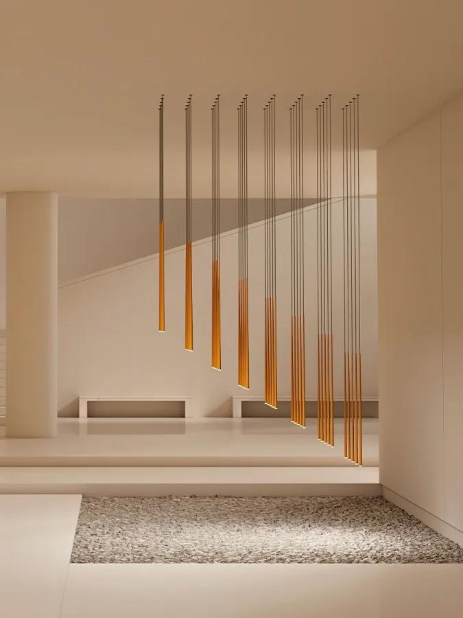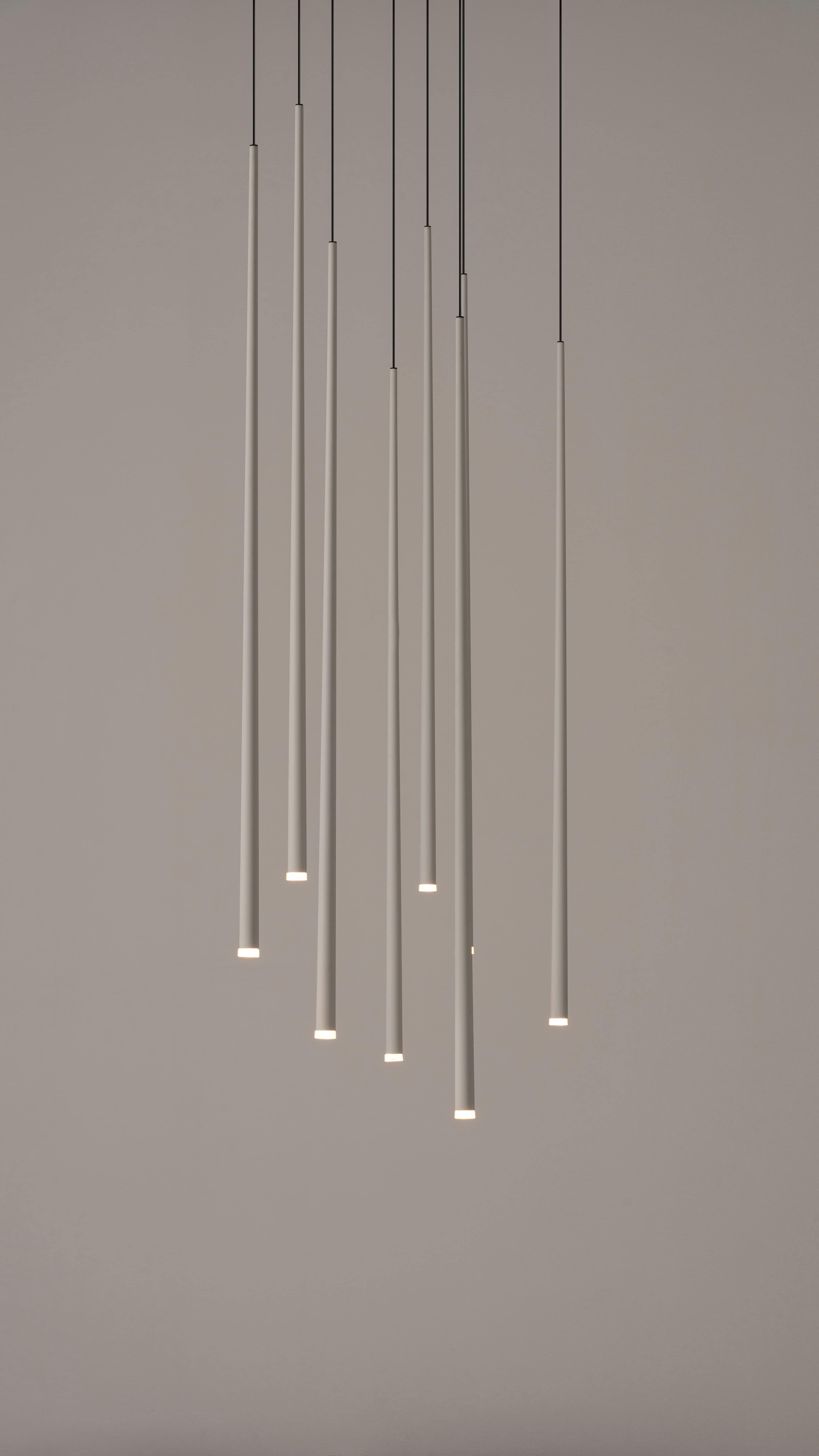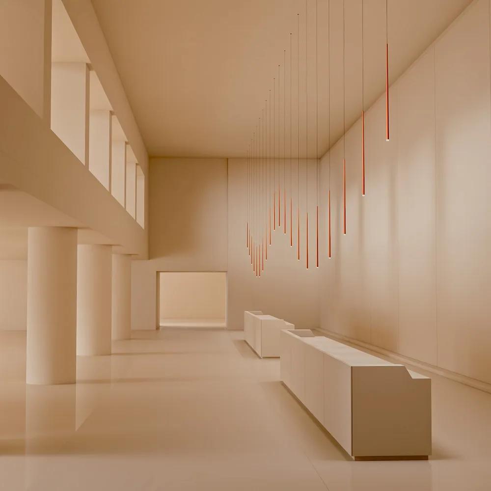 The Slim collection brings an elegant sensibility to the space. Delicate suspensions hang from fibre cables like drops of light, echoing the architecture that surrounds them.