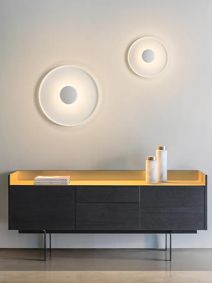 Its small central sphere reflects the light towards a larger surrounding ring generating a halo type effect of even and indirect lighting and creating a relaxed ambience. The light appears to be framed within its own diameter, its attractive and minimalist design doubles as a piece of abstract wall art.